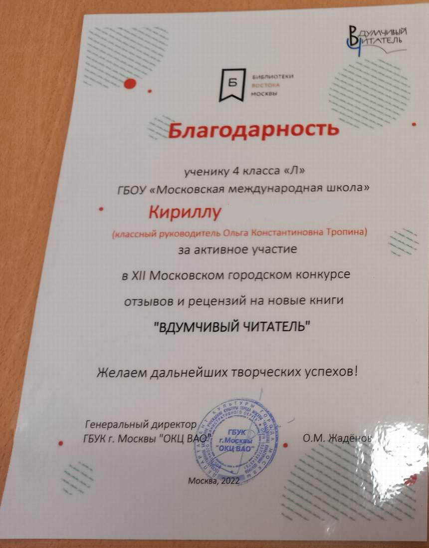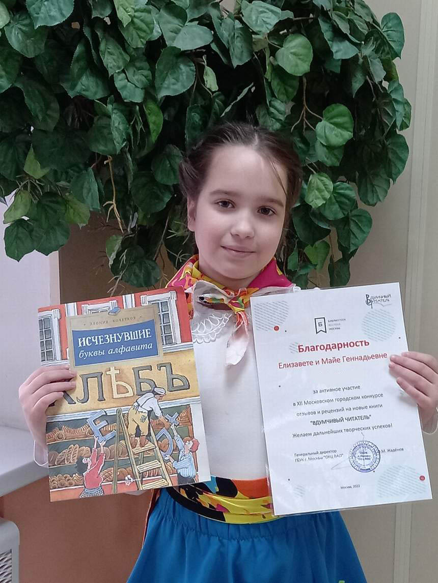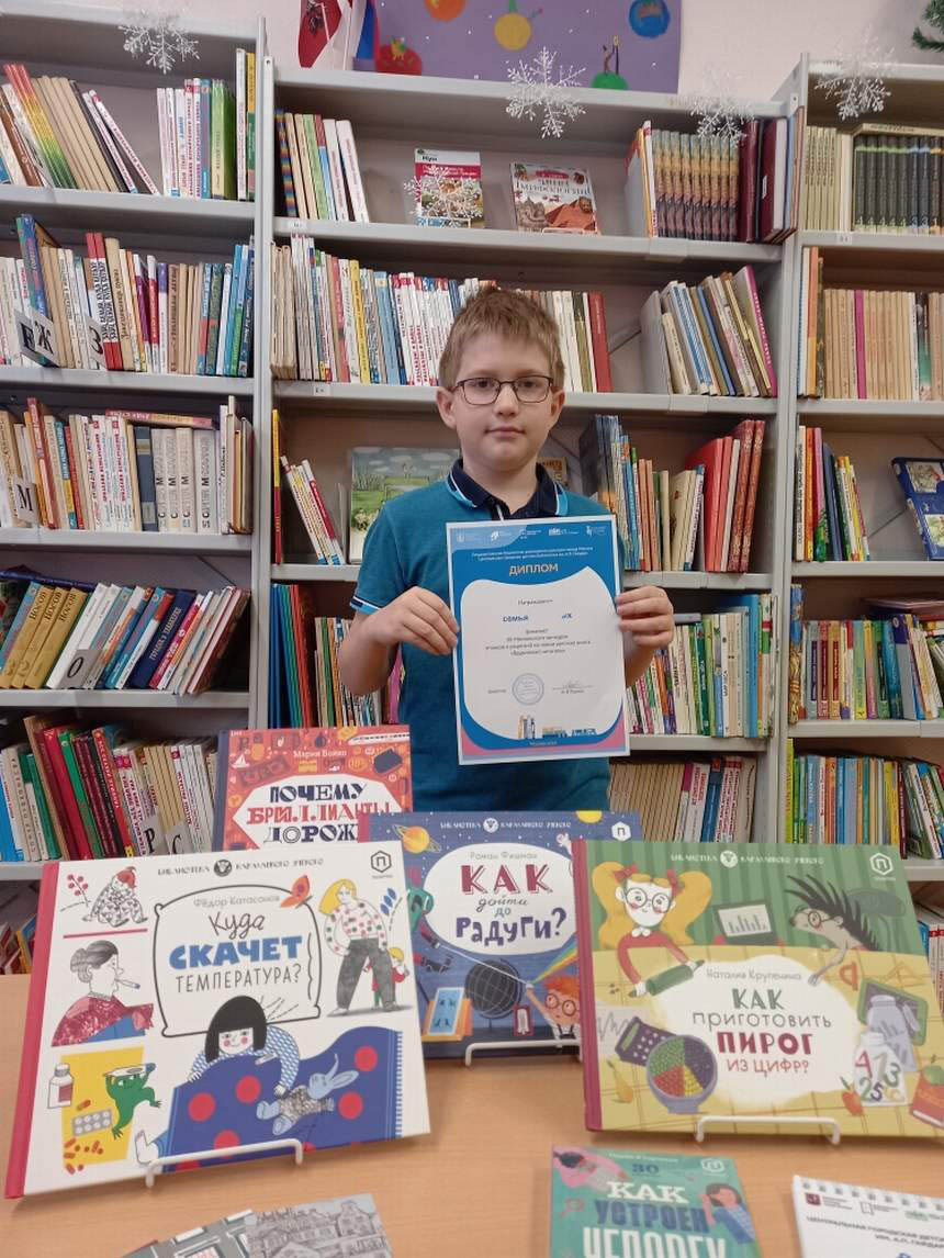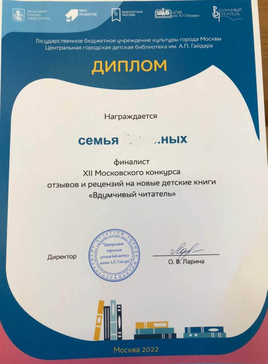 Поздравляем финалиста 12-сезона Московского конкурса отзывов на новые детские книги «Вдумчивый читатель» в номинации «Семейные команды Никиту В., учащегося 3 класса «Г» и его семью.