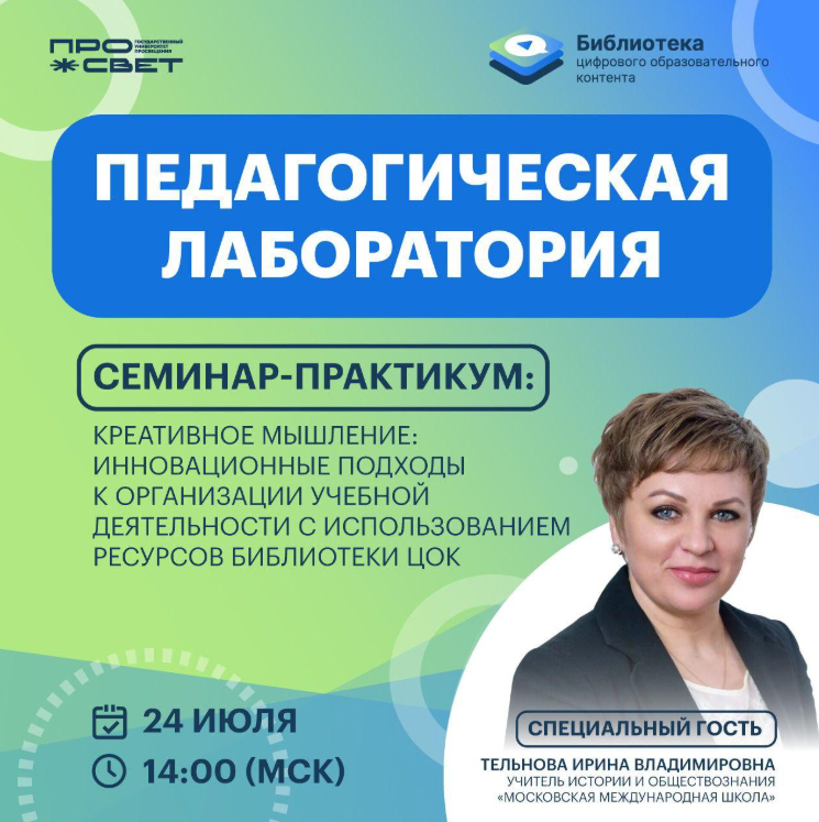 Июльский цикл мероприятий посвящен развитию гибких навыков средствами Библиотеки ЦОК: критическое мышление, коммуникация, креативность и сотрудничество. Тема второго семинара блока: «Креативное мышление: инновационные подходы к организации учебной деятельности с использованием ресурсов Библиотеки ЦОК».