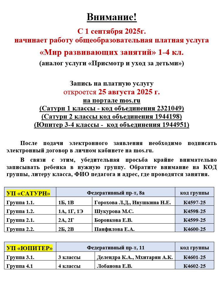 Внимание! С 1 сентября 2025г. начинает работу общеобразовательная платная услуга «Мир развивающих занятий» 1-4 кл. (аналог услуги «Присмотр и уход за детьми»)