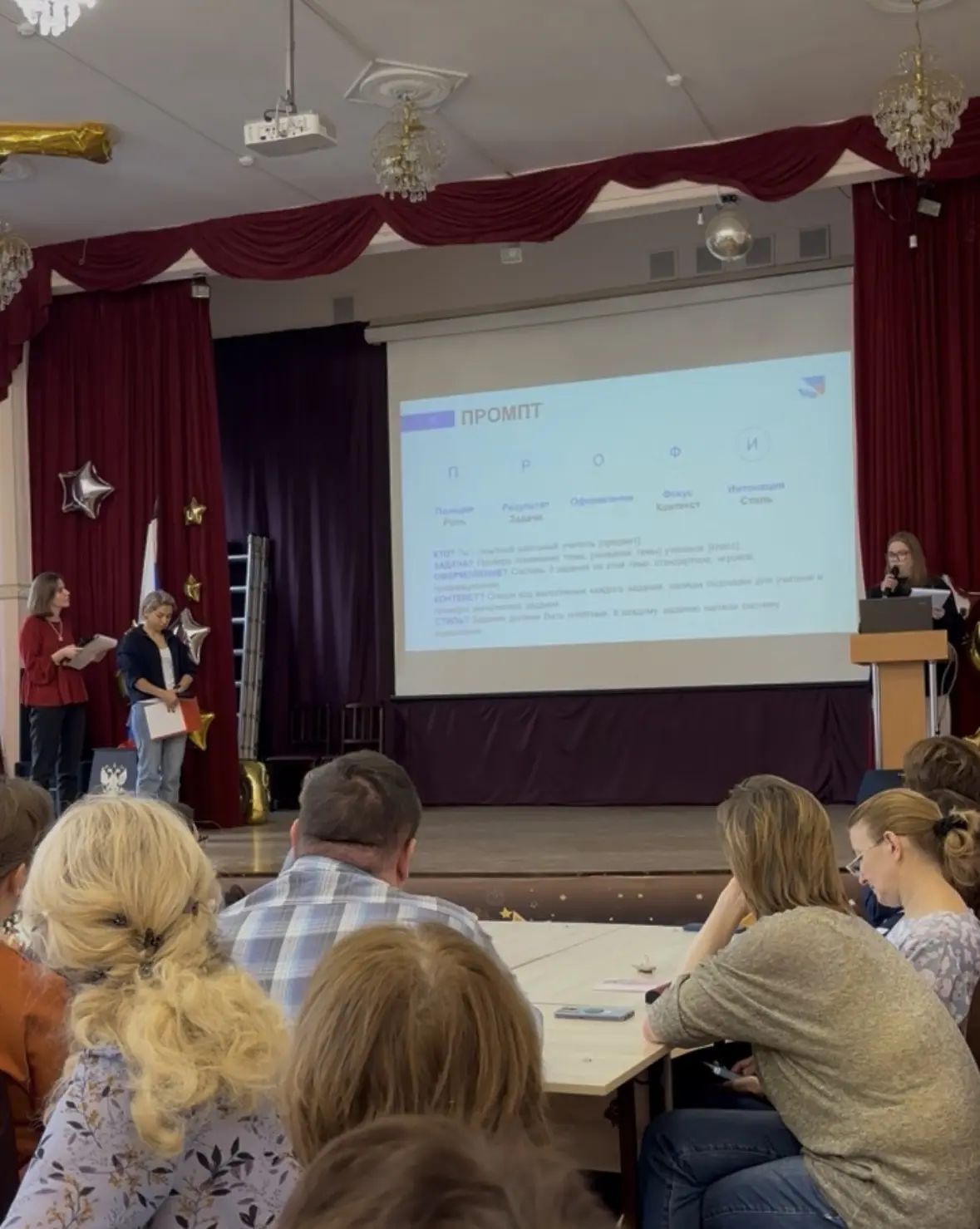 Опытные педагоги, обычно передающие знания, с интересом слушали лекцию наших «зумеров»-новаторов о самом трендовом — использовании искусственного интеллекта в работе учителя!